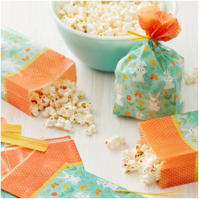 Tenemos las bolsas de golosinas más dulces para envolver tus golosinas primaverales. Un fondo verde menta presenta conejitos blancos, tulipanes amarillos, flores naranjas y mariposas. Incluye 20 bolsas y 20 corbatas.