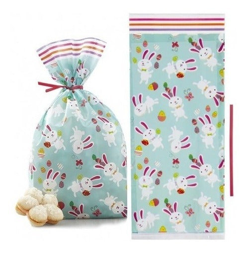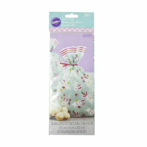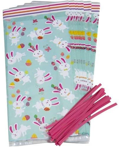Tenemos las bolsas de golosinas más dulces para envolver tus golosinas primaverales. Un fondo verde menta presenta conejitos blancos, huevos de pascua de colores y mariposas. Incluye 20 bolsas y 20 corbatas.