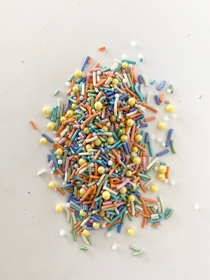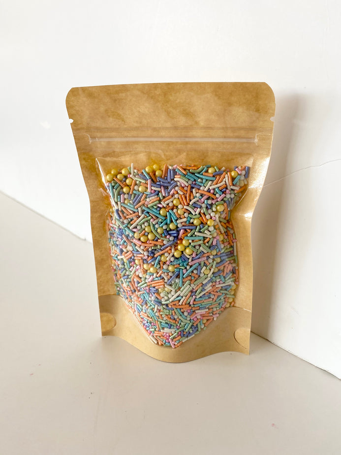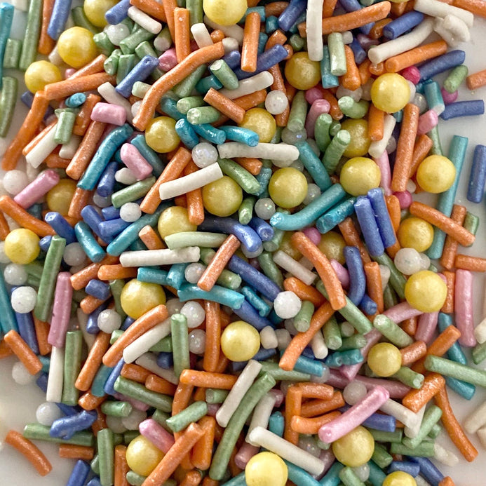 Confetti comestible en tonos primaversales aperlados. Contiene perlas y granillo a base de azúcar en colores variados con tono aperlado.
