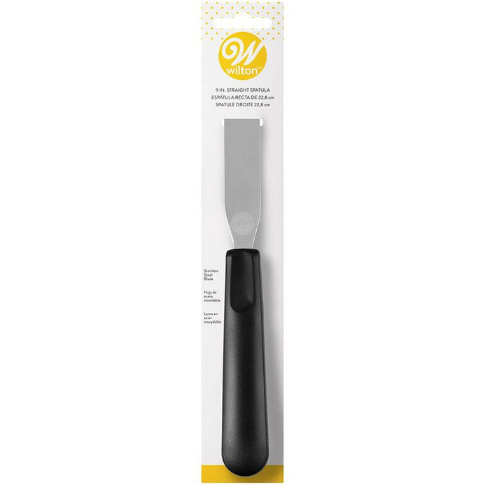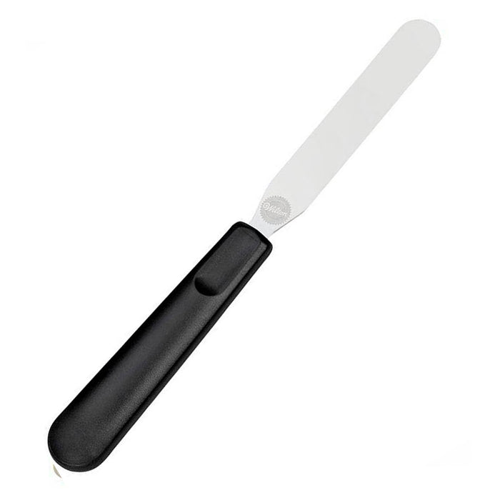 La hoja recta de acero inoxidable de esta espátula con mango negro se desliza sobre el glaseado para lograr un acabado suave y satinado en pasteles y en otros productos horneados.