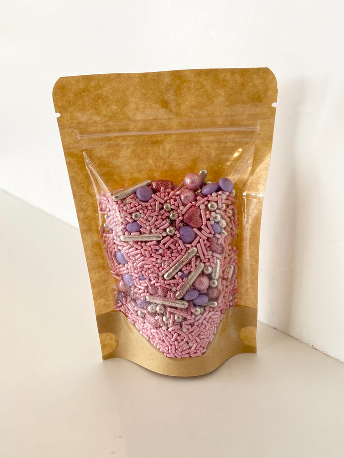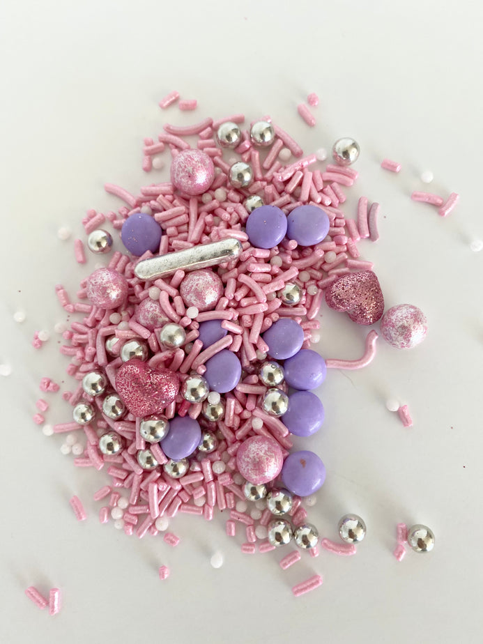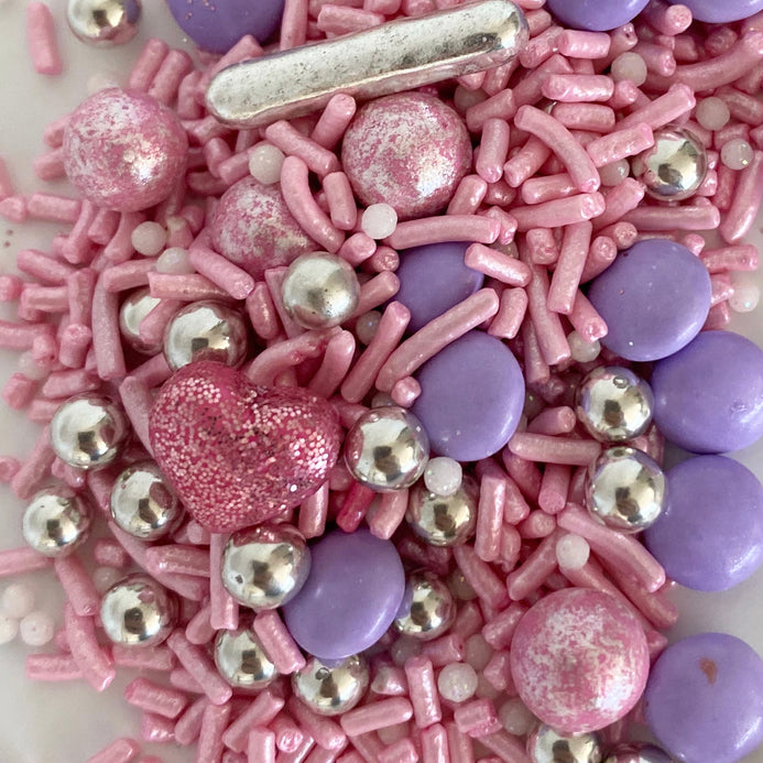 Granillo o confetti comestible en tonos rosas, morado y plateado. Contiene perlas y granillo a base de azúcar en colores variados con tonos aperlados, y diamantina comestible para dar una sensación brillante.