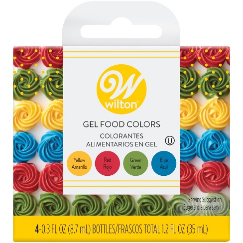 El colorante para alimento en gel en colores primarios marca Wilton, es ideal para darle color a la masa de galletas, masa de pastel, betún o crema de mantequilla o glaseado real (Royal Icing) y también se puede usar para colorear comida o alimentos como huevos de Pascua.